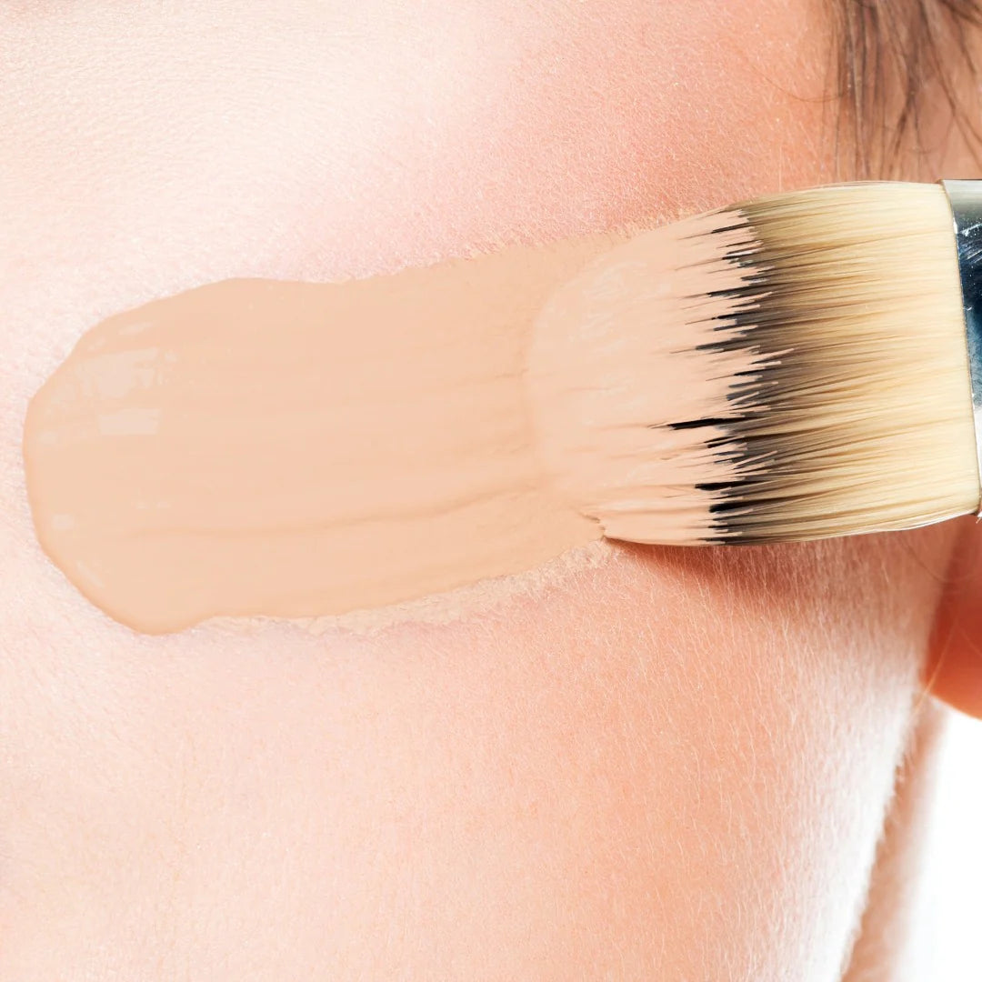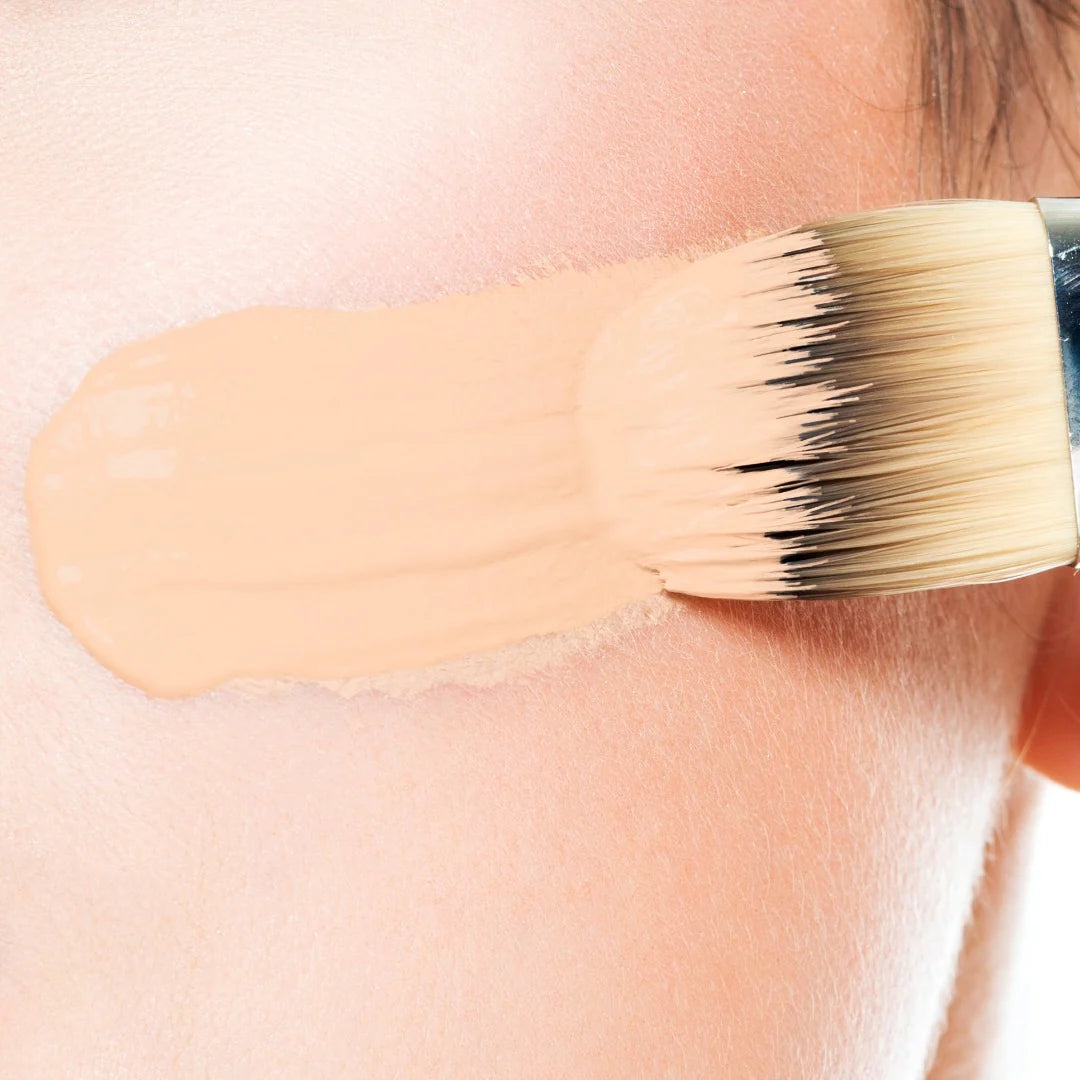 A l'aide d'un pinceau a fond de teint ou d'une éponge. Déposer le produit au centre du visage et l'étirer vers l'extérieur.